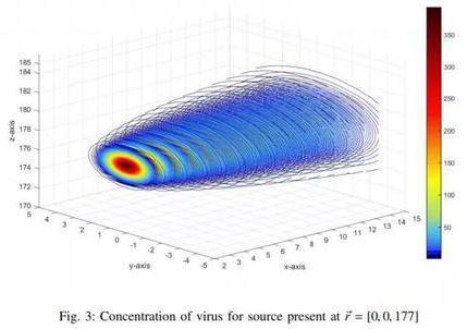 那么,病毒在空气中扩散是什么样子的呢?沙特阿拉伯的阿卜杜拉国王科技大学的研究人员构建了一个模型,模拟含病毒的气溶胶扩散实验,结果如下: